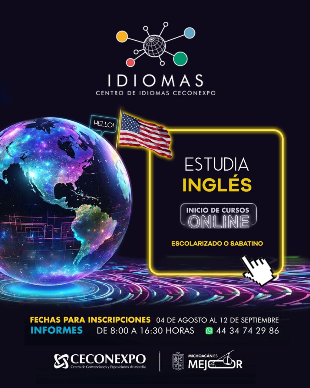 Morelia, Michoacán, 18 de agosto de 2025.- ¿Te gustaría hablar inglés, francés, alemán, italiano o chino mandarín? Esta semana inician las inscripciones para los cursos en línea que ofrece el Centro de Idiomas del Centro de Convenciones y Exposiciones de Morelia (Ceconexpo) en dos horarios, de lunes a viernes y todos los sábados.