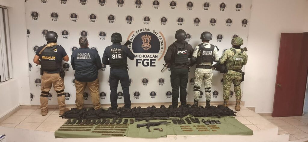 Morelia, Michoacán, 19 de septiembre de 2025.- En un operativo interinstitucional desarrollado en la localidad de El Conejo, municipio de Tzitzio, elementos de la Secretaría de Seguridad Pública (SSP) de Michoacán, la Secretaría de Seguridad y Protección Ciudadana (SSPC), la Secretaría de la Defensa Nacional (Sedena), la Fiscalía General del Estado (FGE), la Guardia Nacional (GN) y la Policía de Morelia aseguraron un importante arsenal y equipo táctico.