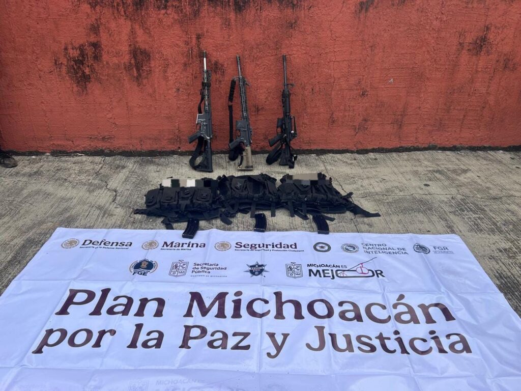 La acción se registró en la calle Taretan, donde personal de la Guardia Civil, junto con fuerzas federales y municipales, detectó a los ahora detenidos portando armas largas y chalecos balísticos con siglas alusivas a una organización criminal.