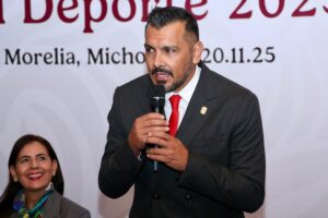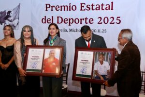 Morelia, Michoacán, 21 de noviembre de 2025.- La Comisión Estatal de Cultura Física y Deporte (Cecufid) entregó el Premio Estatal del Deporte 2025 a la patinadora Naim Bucio Martínez, así como a la Asociación Michoacana de Judo en la categoría de Protección o Impulso a la Práctica de los Deportes.