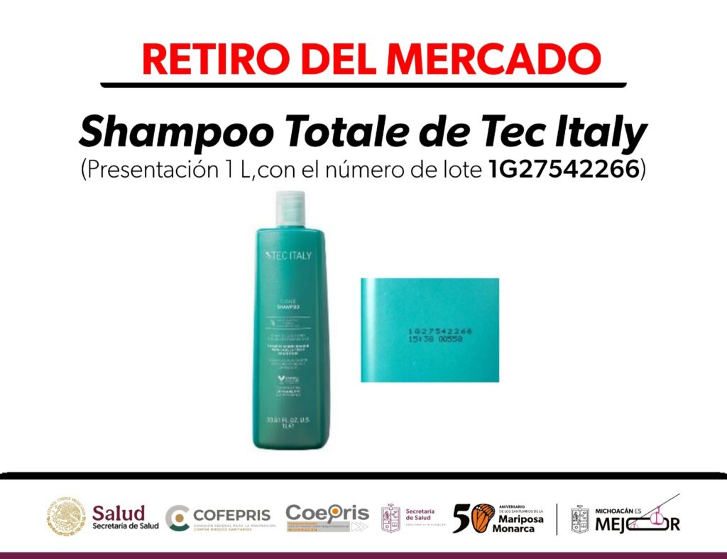 Morelia, Michoacán, 5 de septiembre de 2025.- La Comisión Federal para la Protección contra Riesgos Sanitarios (Cofepris), en coordinación con la Secretaría de Salud de Michoacán (SSM), informó sobre el retiro inmediato del mercado de un lote específico del Shampoo Totale de la marca Tec Italy, en presentación de un litro, fabricado por la empresa Henkel Capital, S.A. de C.V.