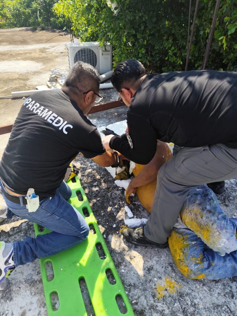 Huetamo, Michoacán, a 15 de octubre de 2025.- Cuerpos de emergencia de Huetamo, entre ellos la Cruz Roja Mexicana, Protección Civil Municipal, brindaron atención a un hombre de 32 años que sufrió graves quemaduras por descarga eléctrica mientras realizaba labores de pintura cerca de un conocido centro llantero ubicado en la colonia Tomatlán.