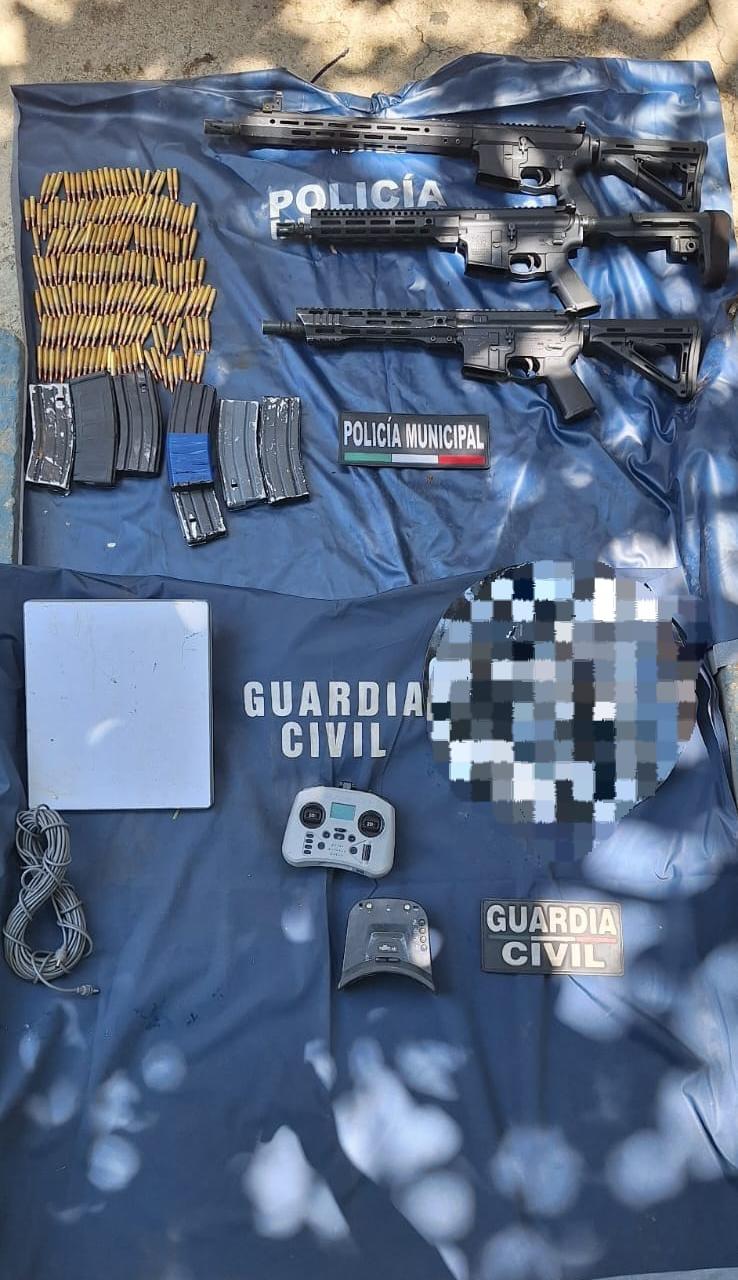 Durante la revisión, a los sujetos les fueron aseguradas tres armas de fuego calibre 5.56 milímetros, 188 cartuchos útiles, siete cargadores, una antena satelital y un control de dron. Todo el material, junto con los detenidos, fue puesto a disposición de la autoridad correspondiente para las investigaciones pertinentes.