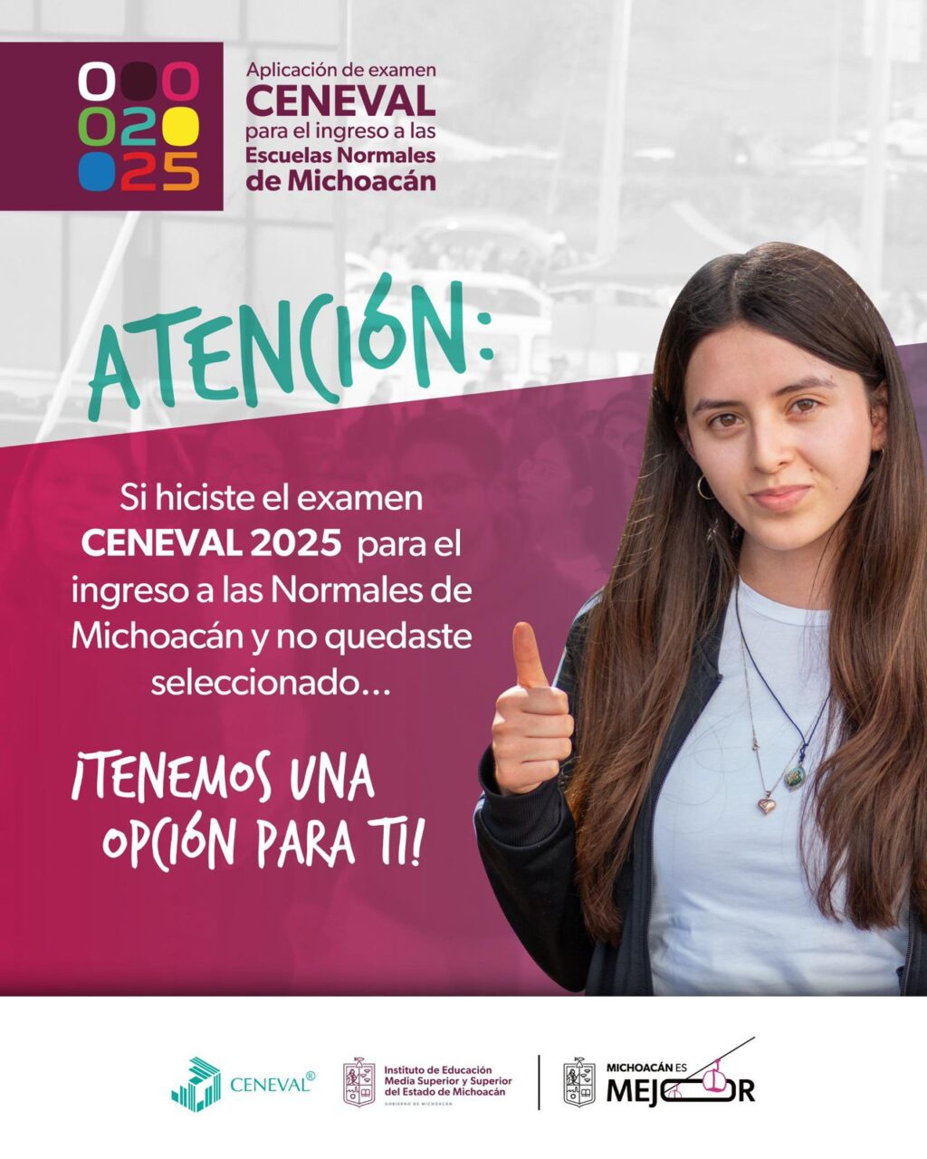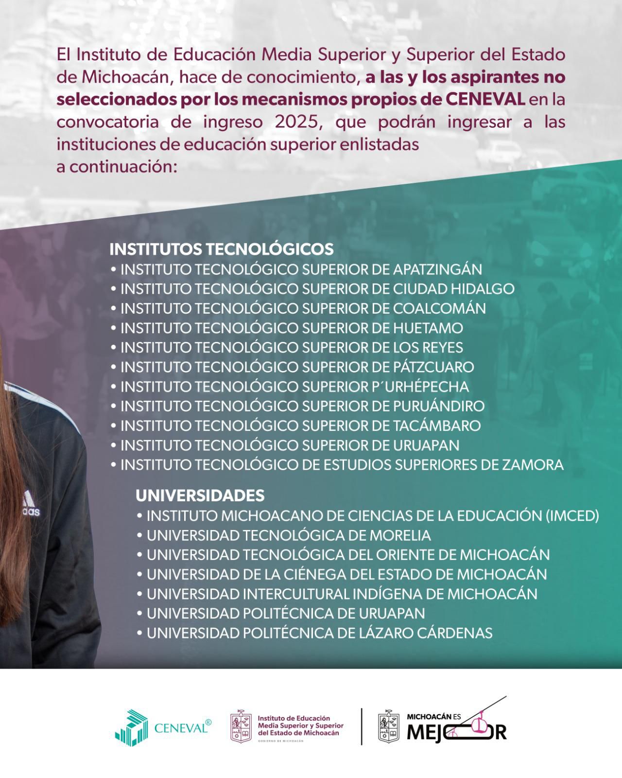 Morelia, Michoacán, 15 de julio de 2025.- El Instituto de Educación Media Superior y Superior del Estado (Iemsysem) anunció que las y los aspirantes que no fueron seleccionados en las Escuelas Normales Oficiales de Michoacán podrán continuar su formación profesional a través de un pase directo a 17 instituciones públicas de educación superior en la entidad.