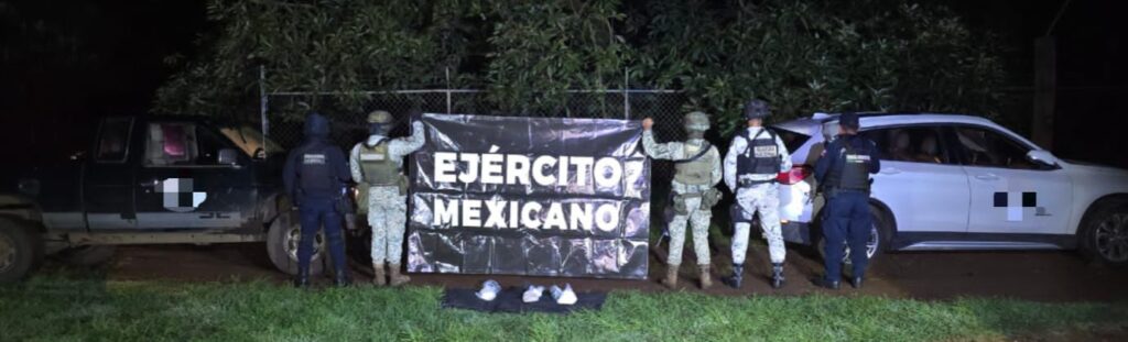 El operativo, realizado en colaboración con la Guardia Civil, el Ejército Mexicano, la Guardia Nacional y la Policía Local, permitió localizar dos vehículos con emblemas de un grupo delictivo en un camino cercano a la localidad de Tanaxuri.