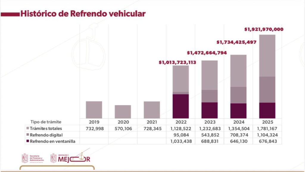 Por su parte, el secretario de Finanzas y Administración, Luis Navarro García, informó que durante 2025 se realizaron un millón 781 mil 167 trámites de refrendo vehicular, de los cuales un millón 104 mil 324 se efectuaron vía digital y 676 mil 843 de manera presencial en ventanilla.