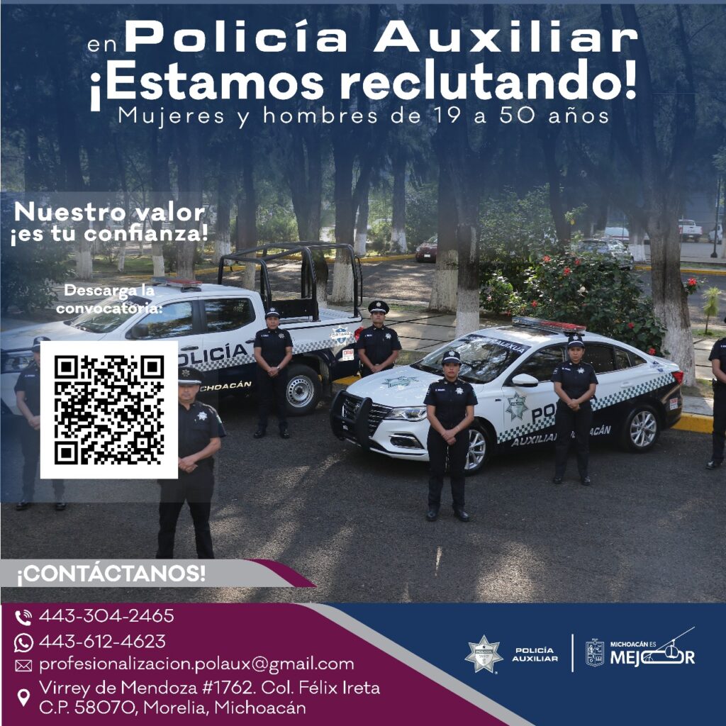 Quienes estén interesadas o interesados pueden comunicarse al 443 304 2465, enviar un mensaje por WhatsApp al 443 612 4623, o acudir directamente a las oficinas ubicadas en Virrey de Mendoza #1762, colonia Félix Ireta, en Morelia. También se puede seguir la convocatoria a través de las redes sociales oficiales: en Facebook como Policía Auxiliar del Estado de Michoacán de Ocampo y en Instagram como @policia.auxiliar.michoacan.