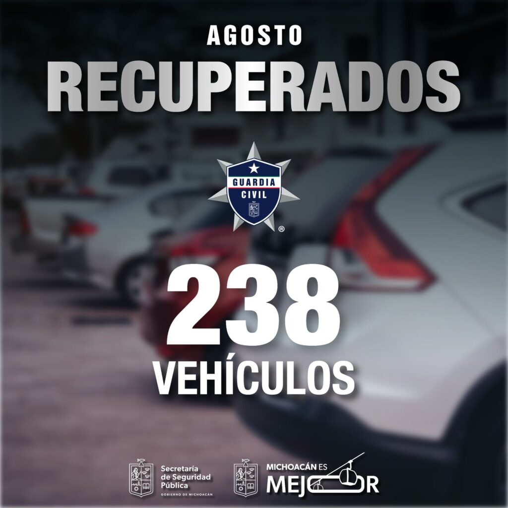 Morelia, Michoacán, 7 de septiembre del 2025.- La Secretaría de Seguridad Pública (SSP) informó que durante el mes de agosto fueron recuperados 238 vehículos en distintos puntos del estado, gracias a los operativos permanentes y a las acciones de vigilancia implementadas por la corporación.