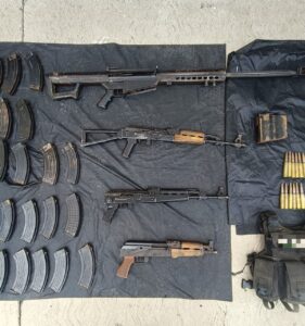 En la unidad se encontraron tres fusiles calibre 7.62×39 mm, un rifle barret calibre .50 con capacidad antiblindaje, 576 cartuchos útiles, 25 cargadores y un chaleco táctico con insignias de un grupo delictivo.