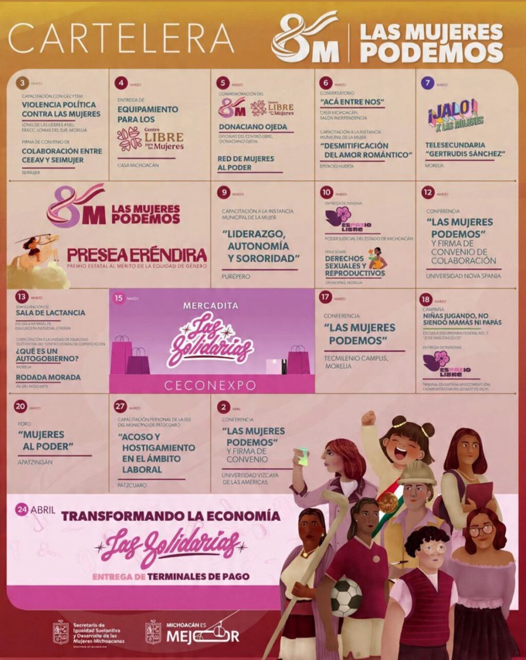 La cartelera del 8M incluye la entrega de la Presea Eréndira, encuentros de formación con instancias municipales, conferencias sobre derechos, ferias informativas, acciones con niñas y adolescentes, así como la Mercadita Las Solidarias, iniciativa que visibiliza el trabajo y los proyectos productivos de mujeres que hoy fortalecen su autonomía económica.