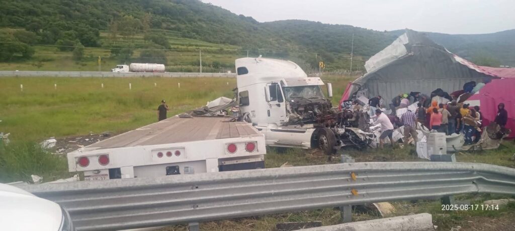 Morelia, Michoacán, 17 de agosto de 2025.- Un tractocamión terminó accidentado en la autopista Pátzcuaro-Cuitzeo, a la altura del entronque con la México-Guadalajara, en jurisdicción del municipio de Copándaro de Galeana.